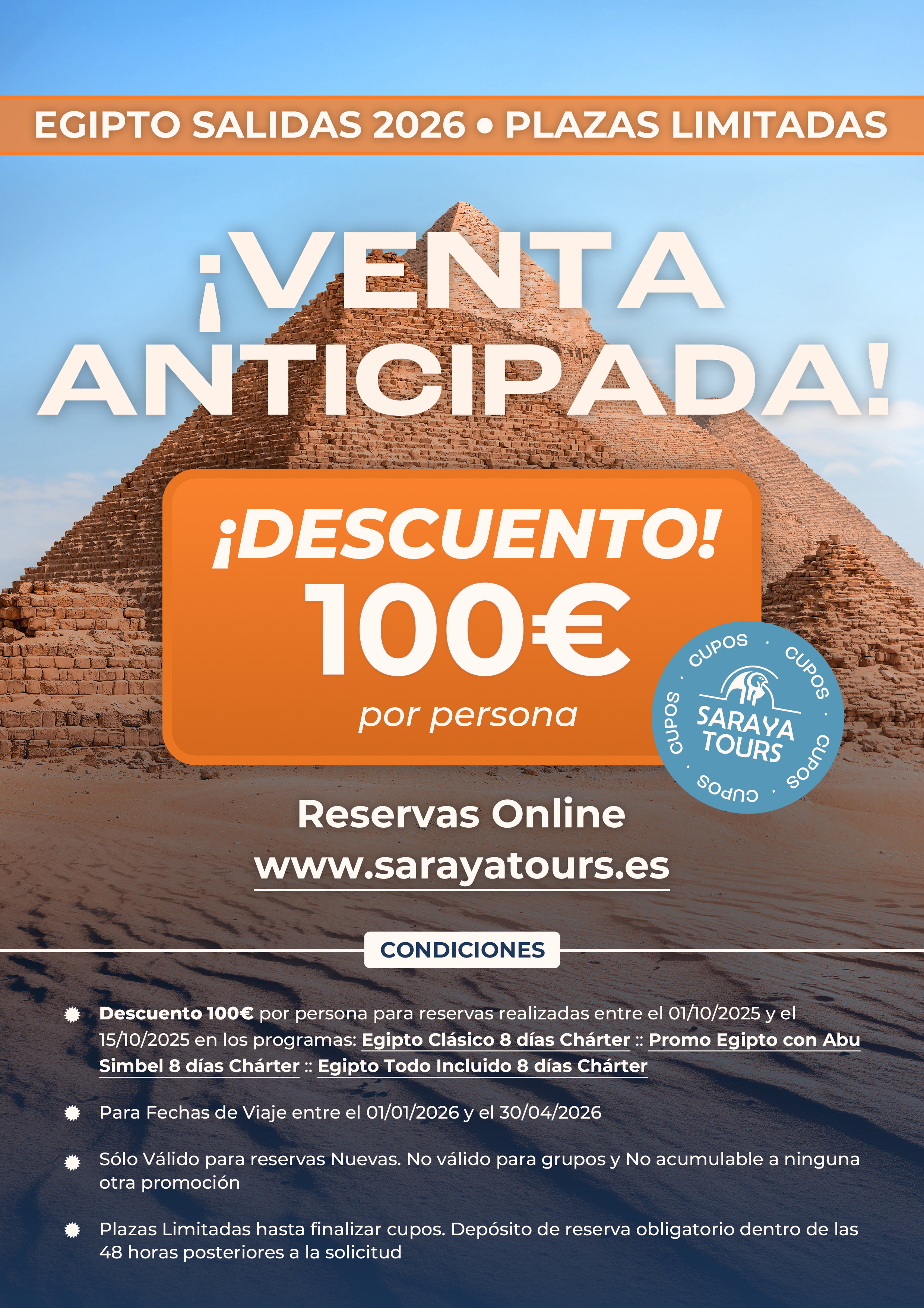 ¡¡ EGIPTO Venta Anticipada !! Descuento 100 € p.persona. Salidas 01/01/26 al 30/04/26. Plazas limitadas.
